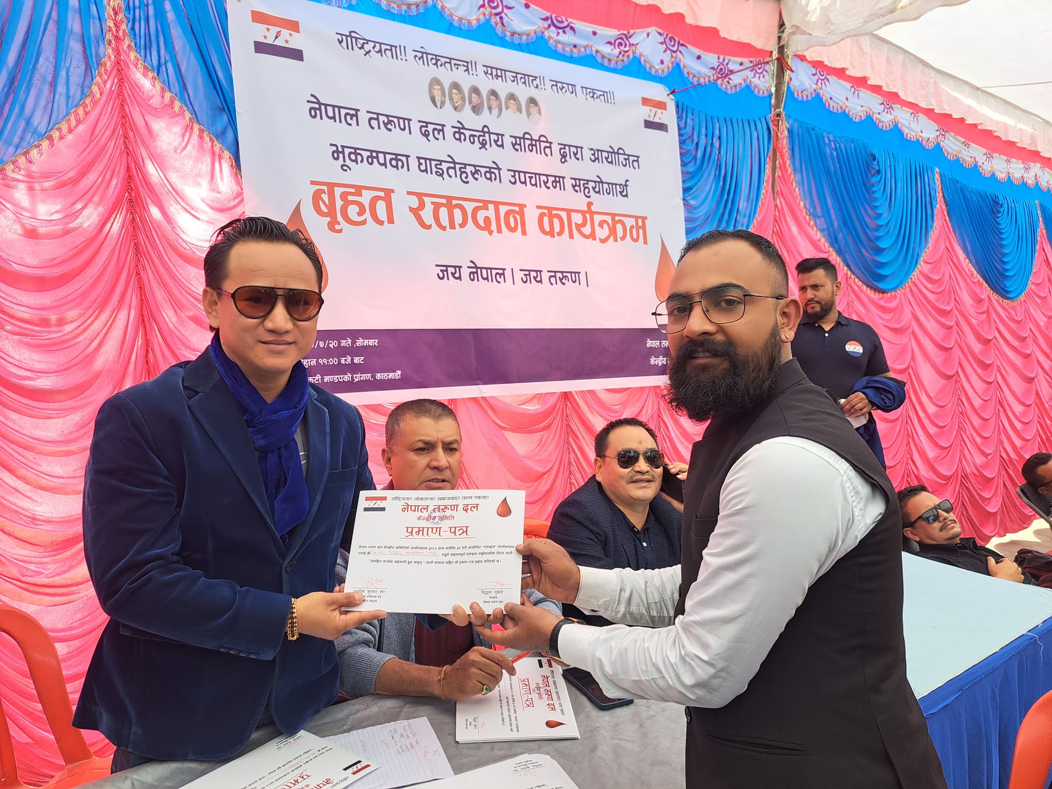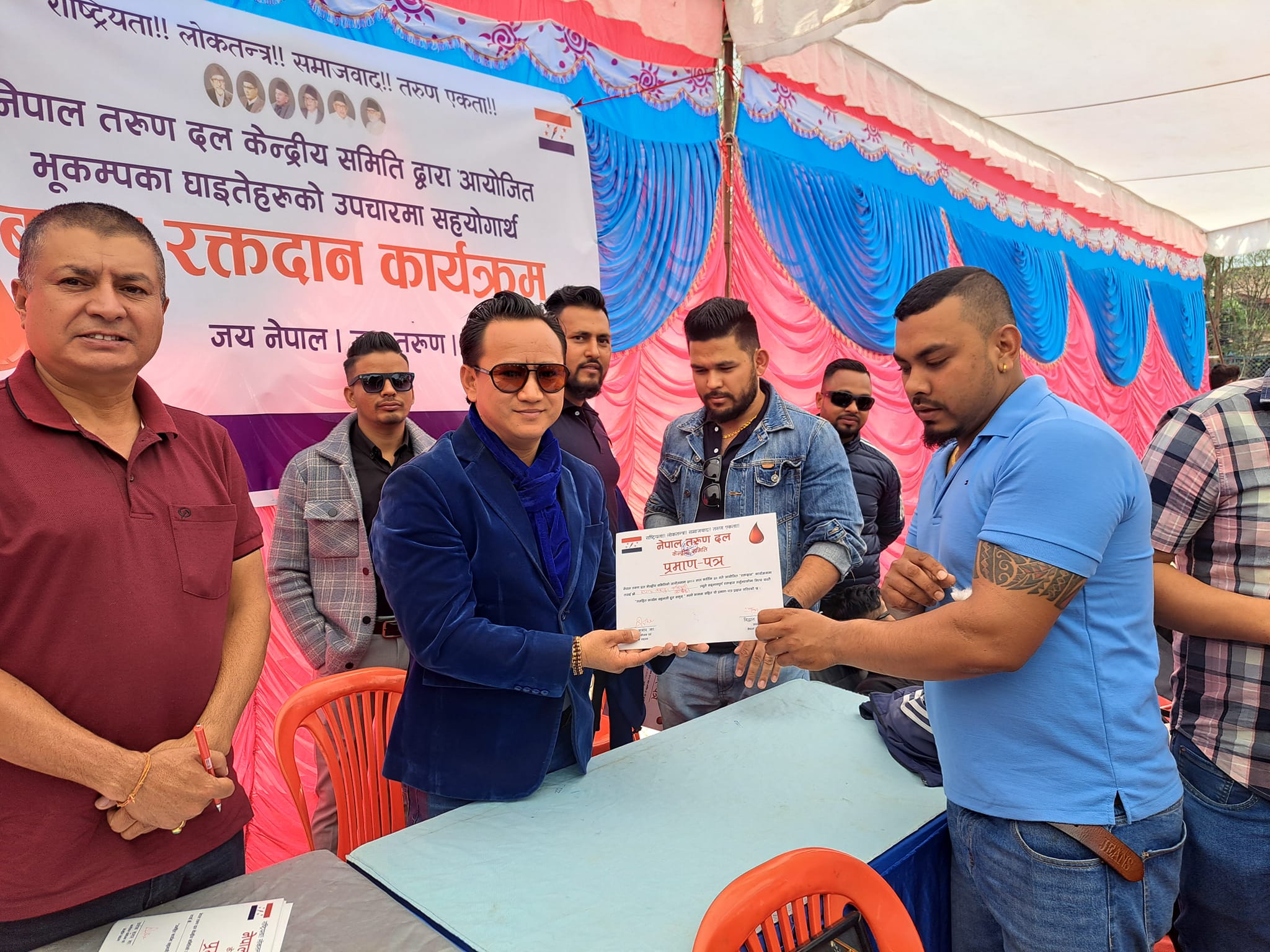 नेपाली कांग्रेसको भातृ संगठन नेपाल तरुण दलले भूकम्पमा परी घाईते भएकाहरुको उपचारमा रगतको अभाव हुन नदिन रक्तदान कार्यक्रम गरेको छ ।