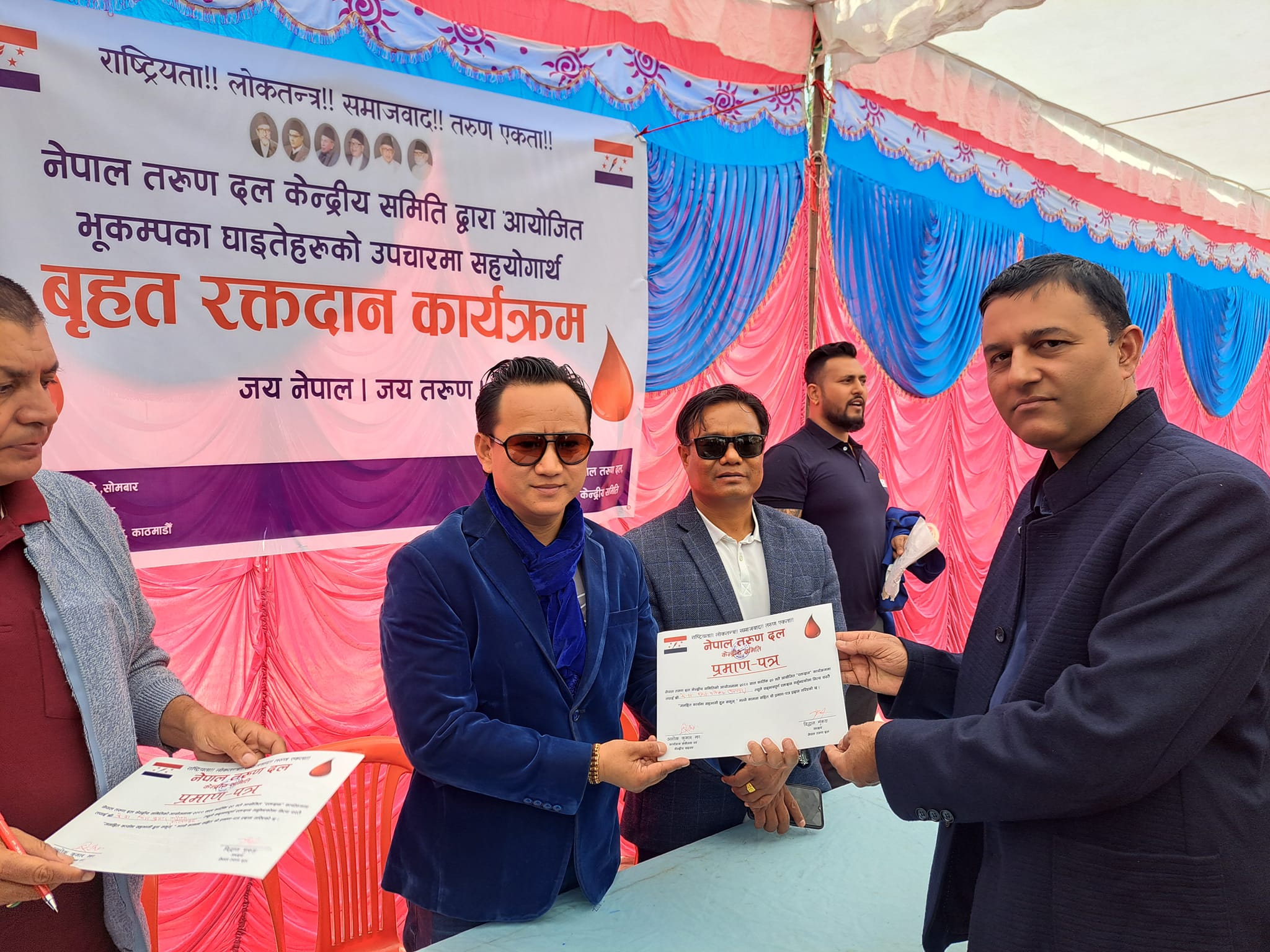 तरुण दलले आज (सोमबार) भृकुटीमण्डपमा रक्तदान कार्यक्रम गरेको हो । रक्तदान कार्यक्रममा नेपाल तरुण दलका अध्यक्ष विद्वान गुरुङ लगायतका नेता तथा कार्यकर्ताहरुको बाक्लो उपस्थिति रहेको थियो गत शुक्रबार जाजरकोटको रामीडाँडा केन्द्रविन्दु भएर ६.४ रेक्टरको भूकम्प गएको थियो । उक्त भूकम्पमा परी एक सय ५३ जनाको मृत्यु भएको छ भने दुई सय ५० जनाभन्दा धेरै घाईते भएका थिए ।