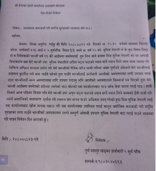 घटनाका आरोपितविरूद्ध इलाका प्रहरी कार्यालय, उर्लावारीमा अभद्र व्यवहार शीर्षकमा उजुरी दिइएको पीडित पक्षले जनाएको छ ।