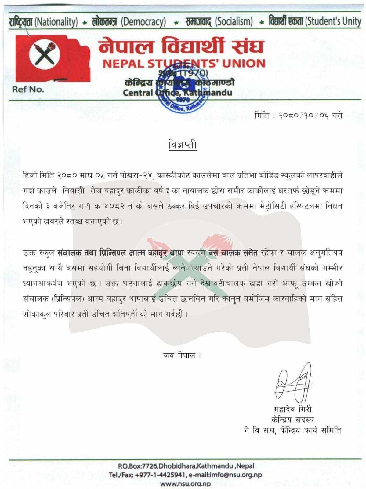 उक्त स्कुल संचालक तथा प्रिन्सिपल आत्म बहादुर थापा स्वयम् बस चालक समेत रहेका र चालक अनुमतिपत्र नहुनुका साथै बसमा सहयोगी बिना विद्यार्थीलाई लाने ल्याउने गरेको प्रती नेपाल विद्यार्थी संघको गम्भीर ध्यानआकर्षण भएको छ ।