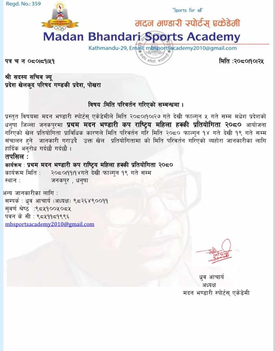 मदन भण्डारी स्पोर्ट्स एकडेमी द्वारा आयोजित प्रथम मदन भण्डारी कप राष्ट्रिय महिला हक्कि प्रतियोगितामा भाग लिन गण्डकी प्रदेश हक्कि सङ्घ पनि सहभागी हुने अध्यक्ष दिपक बहादुर थापाले बताए ।