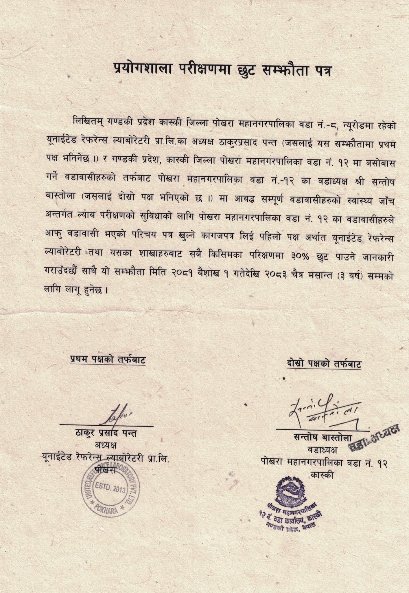 छुटसम्बन्धी सम्झौतामा वडाबासीको तर्फबाट वडाध्यक्ष सन्तोष बास्तोला र युआरएल अध्यक्ष ठाकुरप्रसाद पन्तले सोमबार हस्ताक्षर छन् । गएको शनिबारदेखि लागू भएको छुट सम्झौता २०८३ चैत मसान्तसम्म लागू हुनेछ । वडाध्यक्ष बास्तोला स्थानीयलाई सहज तवरले प्रयोगशाला सेवा दिन सम्झौता गरिएको बताउँछन् । पछिल्लो जनगणनाअनुसार पोखरा १२ को जनसंख्या १२ हजार ७ सय १० छ ।