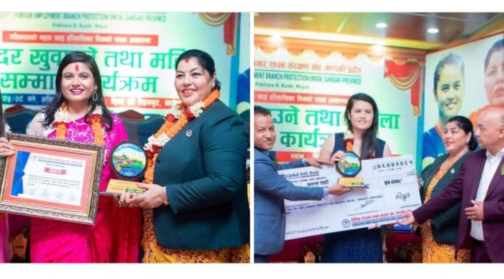 गण्डकी प्रदेशको वैदेशिक रोजगार शाखा संरक्षण संघले पोखरामा आयोजित तीज विशेष कार्यक्रममा राष्ट्रिय महिला भलिबलकी कप्तान अरुणा शाही र नेपाल पत्रकार महासंघ कास्कीकी उपाध्यक्ष जमुना वर्षा शर्मालाई सम्मान गरेको छ।
