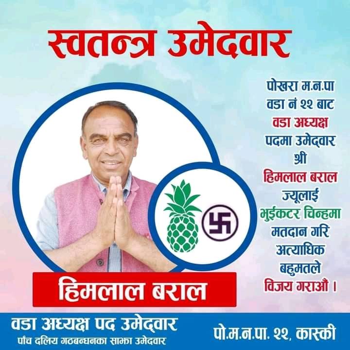 पोखरा २२ का अध्यक्षका प्रत्यासी हिमलाल बरालले हाल आफु स्वतन्त्र उमेदवार सवैको साझा उमेदवार भएकोले पोखरा २२ का जनताको अत्याधिक बहुमत प्राप्त हुने विश्वास व्यक्त गर्नु भयो । समुन्नत पोखराको आधार सबल अर्थतन्त्र र पुर्वाधार भन्ने नाराका साथ ५ दलीय गठबन्धनले पोखराको मेयरमा नेकपा एकिकृत समाजबादीका धनराज आचार्यलाई मेयरमा, काग्रेँकी नेतृ कोपिला रानाभाटलाई उपमेयरमा उमेदवारको रुपमा उठाएको हो । पोखरा २२ को अन्य सदस्यहरुमा कागं्रेसकी लक्ष्मी बराल महिला सदस्य, माओबादी केन्द्रकी कल्पना रसाइली दलित महिला सदस्यमा, खुल्ला सदस्यमा चेतभत्त बराल र हुम बहादुर गुरुङ रहनु भएको छ । समाजवादीको चुनाव चिन्हः कलम, काग्रेंसको रुख, माओबादीको हसिया हतौडा रहेको छ । उक्त कार्यालय उद्घाटन पश्चात उमेदवाहरु घर दैलो कार्यक्रममा व्यस्त भएको निर्वाचन परिचालन कमिटिले जनाएको छ ।