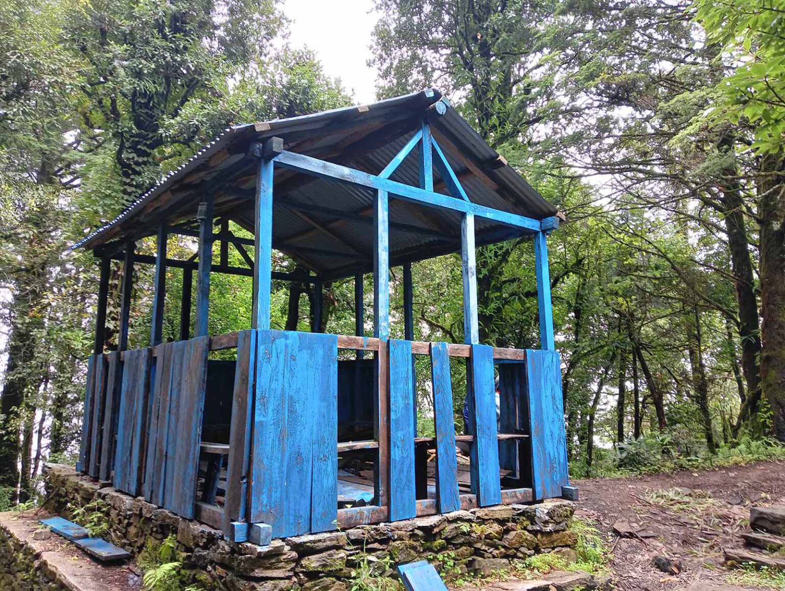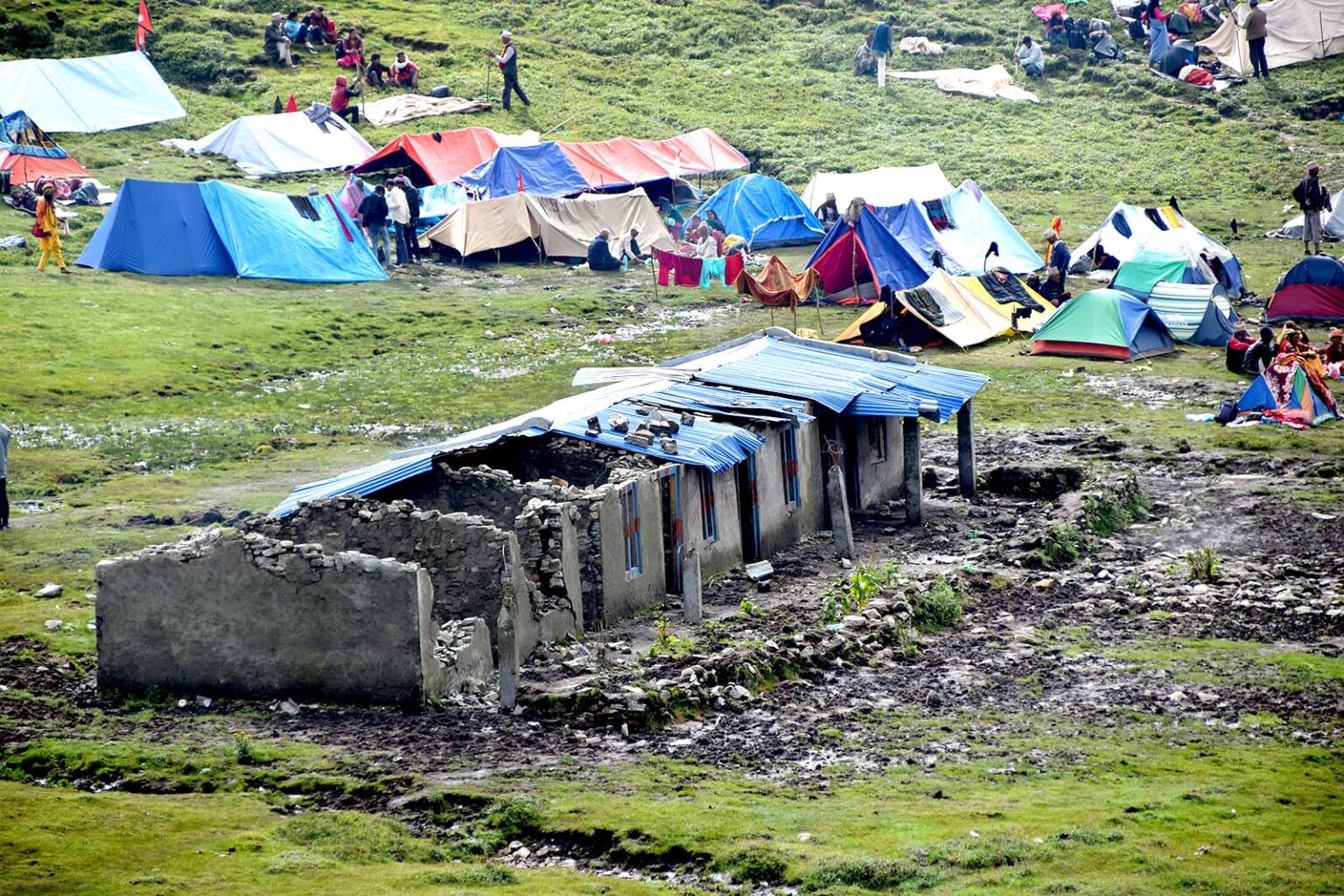 बडिमालिकाको त्रिवेणी पाटनमा तीर्थयात्री तथा पर्यटक आफैंले बोकेर लगेको त्रिपाल टाँगेर बस्नु पर्छ । त्यहाँ बनाइएको धर्मशाला नामको संरचना भत्किसकेको छ । सबै तस्वीर : वसन्तप्रताप सिंह