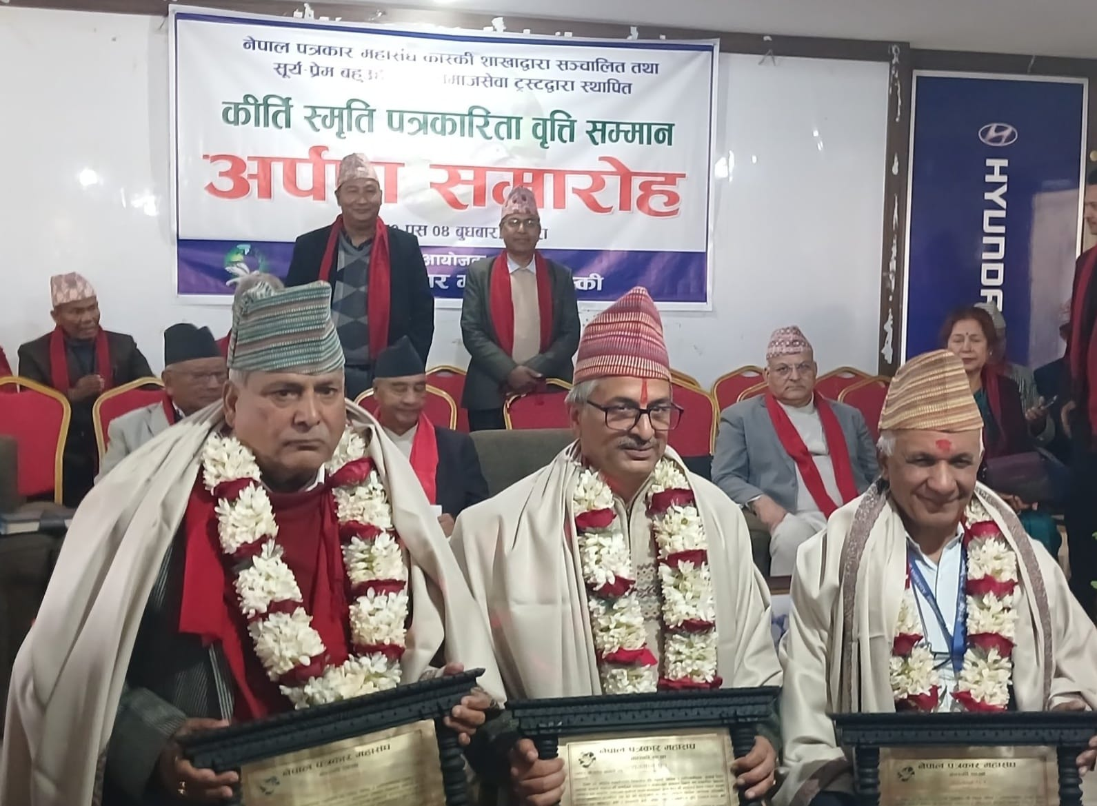 बरिष्ठ पत्रकार डा. सुरेश आचार्य, माधव शर्मा र कृष्णप्रसाद बास्तोला सम्मानीत