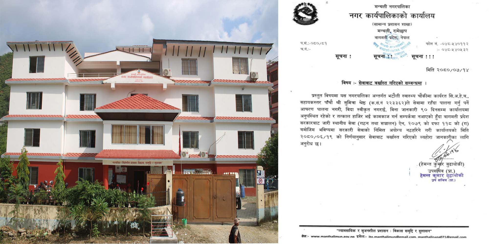 रामेछाप मन्थली नगरपालिकाले वडा नम्बर ७ को भटौली स्वास्थ्य चौकीमा कार्यरत सिनियर कर्मचारी अहेब सुमित्रा श्रेष्ठ बर्खास्त